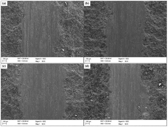 SEM images of the worn surfaces of the composite coatings with various Ni powder contents: (a) 10 wt %, (b) 15 wt %, (c) 20 wt % and (d) 25 wt %.