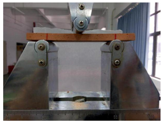 The flexural strength of CBPC follows the fiber reinforced plastic flexural performance test method (GB/T 1449-2005). Figure 1 shows the test setup of the flexural test with a test specimen in place. The flexural modulus of fiber composites is calculated according to Equation (2).