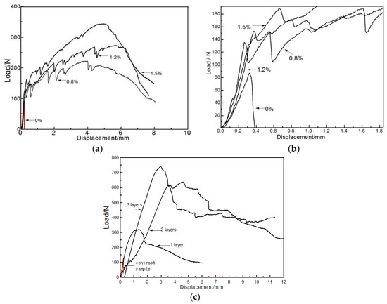 Figure 3 displays the loading-displacement curves of both CBPC composites with short PVA fibers and carbon fiber sheets. Figure 4 shows the failure modes of the control sample and the CBPC composites with short PVA fibers and carbon fiber sheets.