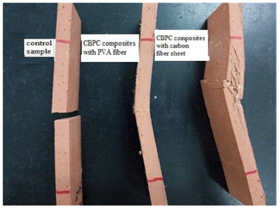 - Both PVA fiber and continuous carbon fiber can significantly improve the toughness of CBPC. When 0.8 wt.% PVA fibers were used, the flexural strength was about twice that of the control sample, and the modulus of elasticity was 3.01 GPa. For 1.5 wt.% PVA fibers, the flexural strength increased to 13.86 MPa, and the modulus of elasticity was 4.2 GPa. For the composite with one layer of carbon fiber sheet, the flexural strength was 14.8 MPa, which is about three times that of the control sample. When two layers of fiber sheets were used, the modulus of elasticity was 5.77 GPa, which was far higher than the control sample and the composites sample with PVA fiber. For three layers of carbon fiber sheets, the flexural strength reached 31.32 MPa, and the modulus of elasticity was 10.88 GPa.