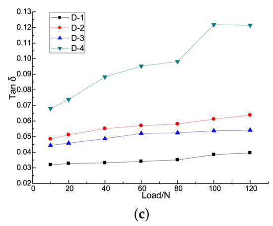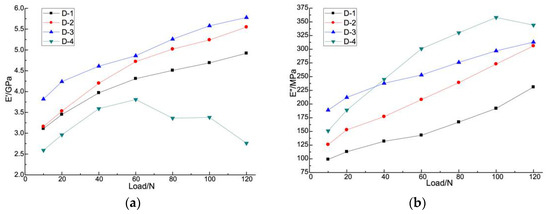 The results of dynamic elastic analysis of phosphate-based fiber composites are shown in Figure 6. It can be seen from Figure 6a that the storage modulus of sample D-4 increased at first and then decreased, while other samples showed an increasing trend with loading. Among all samples, the sample D-3 had the maximum storage modulus at all loads.