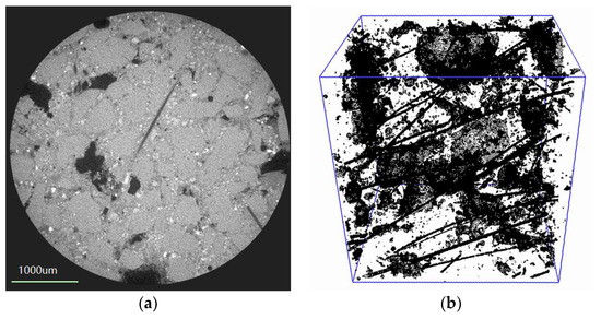 Figure 9 shows the XCT analysis of PVA fiber CBPC composites sample F-10. Figure 9a displays one of the 2D plane figures scanned the sections by the XCT. The 2D figures were then used to complete the 3D reconstruction by Avizo software (Avizo 8.0, FEI, Hillsboro, OR, USA). The region size of the 3D reconstruction was 2.186 mm × 2.621 mm × 2.617 mm, and the 3D reconstructed image is shown in Figure 9b.