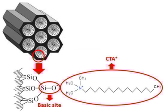 Recent studies have shown that as-synthesized MCM-41 silica, which still contains the surfactant used in the synthesis within the pores, exhibits basic catalytic activity [], due to the presence of siloxy anions (≡SiO−) (Figure 1) generated in the structure by charge compensation with the cations of the surfactant, usually cetyltrimethylammonium (CTA+) []. This silica can be used as a catalyst in the transesterification reaction, with high conversions achieved even under mild reaction conditions [,,].
