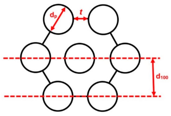 For each calcined silica, the pore diameter and the d100 interplanar distance, corresponding to the (100) plane (Figure 2), were used to calculate the wall thickness, t, according to Equation (2).