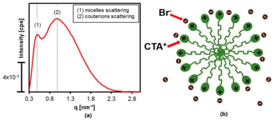 Figure 4a shows the SAXS curve for the 0.064 mol·L−1 dispersion of CTABr in water. According to the literature, the scattering curve for this dispersion presents two correlation peaks. The first, at around 0.5 nm−1, corresponds to scattering by the nuclei of the micelles formed by the hydrophobic CTA+ tails of the surfactant. The second, at around 1 nm−1, corresponds to the X-ray scattering caused by the layer of bromide counterions organized around the heads of the cationic micelles []. It could be inferred from the presence of the two scattering peaks in the SAXS curve for the aqueous dispersion of the surfactant that it was composed of CTABr micelles, which provided a template for formation of the mesoporous MCM-41 silica [].