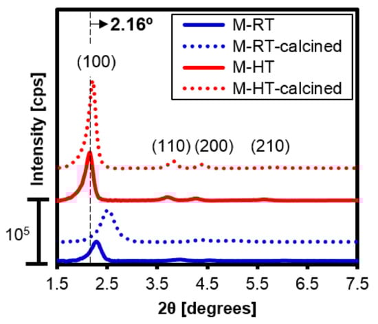 The X-ray diffractograms (Figure 5) showed that the calcined hybrid silicas maintained the MCM-41 type structure, with the diffraction peaks becoming more intense, probably due to loss of the organic cations. In addition, the diffraction peaks shifted to larger angles, which, according to Bragg’s law, resulted from contraction of the corresponding interplanar distances. The greatest displacement observed for M-RT-calcined silica was due to the higher amount of CTA+ present in its structure, which after removal during calcination causes the contraction of the interplanar distance. The CTA+ amounts will be presented in thermal analysis.