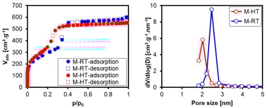 The nitrogen adsorption and desorption isotherms obtained at 77 K (Figure 6a) were type IV, typical of mesoporous materials []. An increase of the adsorbed volume at relative pressures between 0.2 and 0.5, with the presence of an inflection, corresponded to the capillary condensation of N2 within the mesopores, as typically observed for materials of the M41S family [].