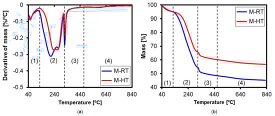 (a) DTG (derivative of mass) curves; (b) thermograms of the as-synthesized silicas. The different regions indicated correspond to (1) water desorption, (2) surfactant degradation by Hoffman reactions, (3) degradation of residual products, and (4) condensation of silanol groups.