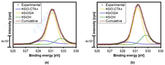 The basicity of the ≡SiO− sites of the as-synthesized silicas was characterized by O1s X-ray photoelectron spectroscopy (XPS). The spectra were acquired using a ESCA+ EAC 2000 instrument coupled to a high-performance hemispherical analyzer (Scienta Omicron, Taunusstein, Germany), with excitation using Al Kα radiation (hν = 1486.6 eV). The contributions of the ≡SiO−CTA+, ≡SiOSiO≡, and ≡SiOH species were calculated by signal deconvolution [].