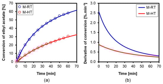 Conversion (a) and derivative conversion (b) curves for the [CTA]-MCM-41 hybrid silicas used in ethyl acetate methanolysis.