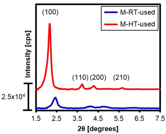 The X-ray diffractograms of the silicas recovered at the end of the transesterification reaction (Figure 11) showed that the characteristic diffraction pattern of MCM-41 was maintained. A relative intensity of 13% was obtained for the (100) peak of the used M-RT catalyst, compared to the M-HT silica, corresponding to a decrease of 71% relative to the peak obtained for the material before use. The M-HT silica used presented a relative peak intensity of 81%, compared to the signal obtained before use. These results showed that the hydrothermal treatment led to a catalyst with greater structural stability when used in the transesterification reaction.