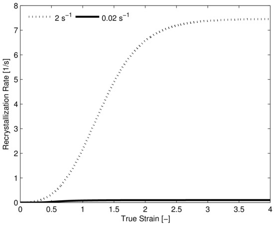 Predicted recrystallization rate HSLA-steel for strain rates 0.02 s and 2 s, the maximum recrystallization rate at the higher-strain rate is approximately 74 times that of the lower strain rate.