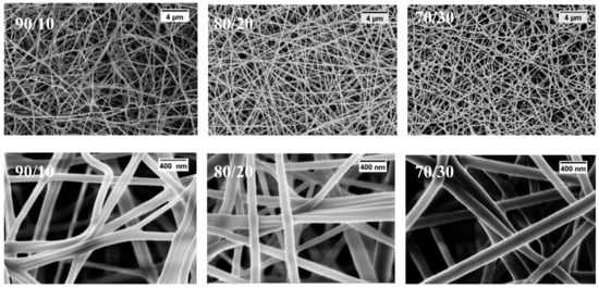 Fiber morphology of thermally-treated electrospun PVA/PMA membranes for different PMA contents. The morphology of pure PVA nanofibers can be found in our former study [15].
