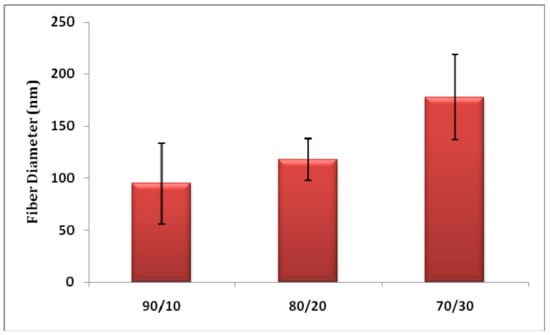 Figure 1 shows the morphology of heat-treated PVA/PMA nanofiber membranes at different PMA contents. As can be seen, the nanofibers are bead-free and have a uniform shape. The diameters of the nanofibers are compared in Figure 2. As can be seen, the fiber diameter increased from 89.14 ± 41.12 to 177 ± 40.51 nm, when the PMA content increased from 10 to 30%. It is known that a higher Mw polymer increases the viscosity of the electrospinning solution and results in a larger fiber diameter [17]. As the PMA has a considerably higher Mw than the PVA, the higher PMA contents can increase the solution viscosity and fiber diameter.