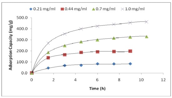 Static adsorption performance of the PVA/PMA (80/20) nanofiber membrane at different lysozyme concentrations (pH = 6) as a function of time.