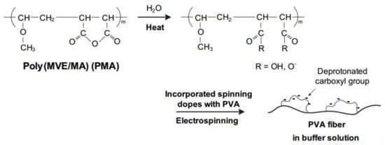 Scheme of negative surface charges of PVA/PMA nanofibers. The pH = 4 is necessary to produce the hydrolysis. (Reprinted from ref. [15] with the permission of Elsevier).