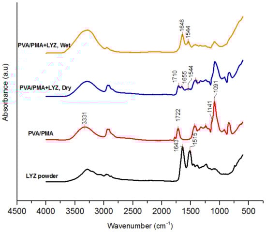 Figure 6 shows the FTIR spectra of the PVA/PMA (80/20) membranes before and after lysozyme adsorption. The spectrum of the lysozyme powder is also displayed for comparison. The amide peaks I and II at about 1643 and 1515 cm−1 related to LYZ [19] can be clearly seen at PVA/PMA + LYZ. This confirms that the protein was adsorbed on the surface of the nanofiber membranes. Moreover, the adsorption peak at 1722 cm−1 related to the carbonyl group of PMA was not present on the spectrum of the adsorbed (wet) membranes. Also, the peaks at 1091 and 3331 cm−1 related to the C-O and O-H groups of PVA had a lower and a higher intensity compared to those of the pristine membrane. This might be related to the water inside the membrane, which can affect the FTIR peak resolution. The water can form hydrogen bonding with the hydroxyl and amide functional groups of the polymers influencing the shape/adsorption of the peaks. When the membrane was dried completely, those adsorption peaks reappeared on the spectrum. The obtained pH/FTIR results for 0.2 mg/mL can be applied to higher lysozyme concentrations.