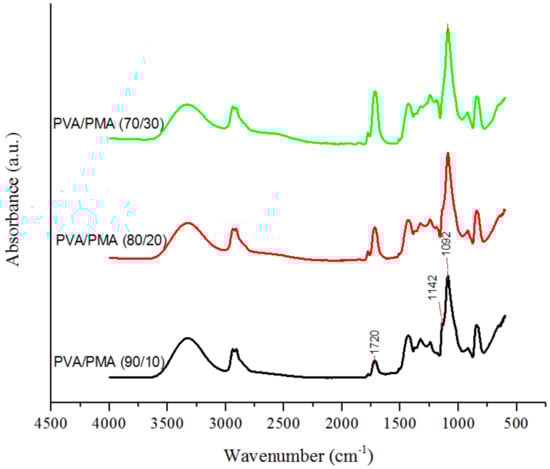 FTIR spectra of thermally treated PVA/PMA nanofiber membranes for different PMA contents.