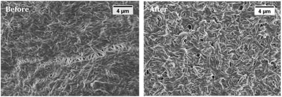 Membrane reusability is the use of existing membranes for multiple cycles before replacing them. Reusing membranes can increase the operational flexibility and reduce material and labor costs. To investigate this, the adsorbed membrane was first eluted with sodium hyroxide (1 M), and was then rinsed with DI water using a syringe pump. Table 4 reveals the lysozyme concentration of the PVA/PMA (80/20) membrane before and after sodium hydroxide elution. As it can be seen, the base removed most of the proteins from the membranes. Interestingly, the adsorption capacity of the membrane before and after the elution was almost the same, indicating the effectiveness of the recycling process. This can be explained by the fact that the base increased the pH around the membrane, weakening the electrostatic interaction between the charged nanofibers and the charged protein. When pH > IP, both the lysozyme and nanofibers are negatively charged and the repulsive force between them results in the complete removal of the protein from the membrane surface. Figure 8 displays the morphology of the nanofiber membranes before and after elution. As can be seen, the nanofibers were a little bit swollen after the elution, due to the water absorbed by the PVA. Nevertheless, the physical structure of the fibers remained stable after elution due to chemical crosslinks between the polymers during heat treatment. The obtained results would enhance the practical applications of PVA/PMA membranes for protein separation.