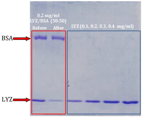 SDS-PAGE analysis for the purification of LYZ solutions and LYZ/BSA mixture (Buffer pH = 6).