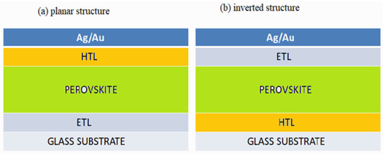 Typically, there are two major device architectures for organo-metal halide perovskite structure without considering the mesoscopic nano-material; planar heterojuction (n-i-p) and inverted structure (p-i-n) [24]. For planar heterojunction, the electron transporting layer (ETL) is spin cast on a glass substrate (e.g., Fluorine-doped tin oxide (FTO)/glass or Indium tin oxide (ITO)/glass followed by perovskite photo-active layer, hole-transporting material (HTL), and finally a metal contact (e.g., silver or gold). In the inverted planar architecture, the hole-transporting material (HTL) is first deposited on a glass substrate then deposition of perovskite layer, electron transporting layer (ETL), and finally a metal contact as shown in the schematic diagram of inverted structure and conventional structure in Figure 2a,b respectively. The most reported inverted planar heterojunction device is PEDOT:PSS [poly (ethylenedioxythiophene): poly (styrene sulfonate)]/perovskite layer/PCBM (phenl-C61-butyric acid methyl ester). In this device, PEDOT:PSS and PCBM function as HTL and ETL respectively. The inverted structure exhibits significant power conversion efficiency (PCE) and virtually free-hysteresis in the voltage-current output, easy fabrication method, and cost effectiveness [25,26]. For conventional planar configuration, using metal-oxide (such as TiO2, SnO2 or ZnO) as the electron-transport layer (ETL), the device could show high performance under reverse scan (open-circuit voltage to short circuit current scan). Poor electron injection and extraction exhibited in p-i-n perovskite structure might be due to a barrier at the contact interface between Fermi level of the metal electrode and the lowest un-occupied molecular orbit of the ETM. That is why currently inverted structure is not yet achieved comparable power conversion efficiency to regular planar perovskite architecture [27]. Planar architecture can be further simplified by removing an expensive hole transporting material (HTM) commonly spiro-OMeTAD into a new design called planar HTM-fee architecture [28]. Planar structure with HTM-free is also a promising direction towards reducing the fabrication cost and enhancing the efficiency and stability of perovskite solar cells. Reference [29] designed a planar HTM-free based solar cells and the device exhibited relative stability. This directed towards a potential application of cost effective solar devices.