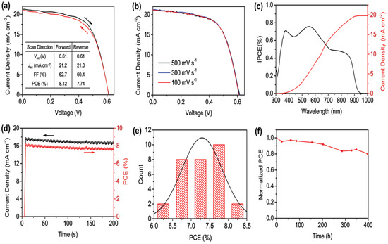 (a) J-V curves of the champion device measured using both forward and reverse scan mode at rate of 300 mV/s under the simulation of A.M 1.5 G, 100 mW/cm2; (b) J-V curves of the champion drvice measured at different scan rates using forward scan mode under the simulation of A.M 1.5 G, 100 mW/cm2; (c) Incident photon-to-current efficiency (IPCE) spectrum of the encapsulated (FA)0.75(MA)0.25SnI3- based device (d) steady state Jsc and PCE of the (FA)0.75(MA)0.25SnI3 measured at a bias of 0.46 V under AM 1.5 G, 100 mW/cm2 irradiation (e) PCE histogram of 30 (FA)0.75(MA)0.25SnI3-based device from several fabrication batches; (f) Normalized PCE of a (FA)0.75(MA)0.25SnI3-based device stored in glovebox over a period of 400 h. Reproduced with permission [32]. Copyright-WILEY-VCH Verlag, GmbH & Co. KGaA, Weinheim, Germany, 2017.