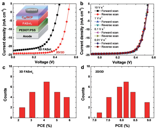 Device structure and characterization. (a) J-V curves under one sun AM 1.5 G condition for the champion devices containing pure 3D and 2D (0.008 m)/3D perovskite (the inset shows the device structure); (b) forward and reverse sweeps of the J-V characteristics of the champion 2D/3D perovskite cell measured at different rates; (c) histogram of the reference cell reproducibility, and (d) of the 2D/3D perovskite devices. Reproduced with permission [51]. Copyright-WILEY-VCH Verlag, GmbH & Co. KGaA, Weinheim, Germany, 2018.