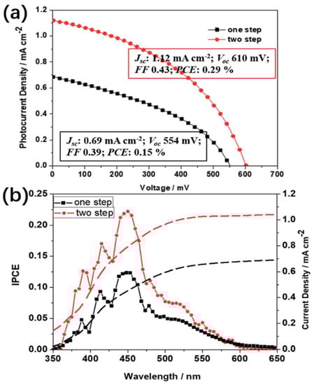 (a) J-V curves for the best performing devices by the one-step and the two-step method, respectively, measured under simulated AM1.5 G irradiation; (b) Corresponding IPCEs. Re-used with permission from [64]. Copyright, Royal Society of Chemistry, 2017.