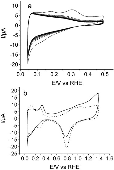 Cyclic voltammograms recorded for a Pt electrode in 1 M of HClO4 solution containing 10 mM of piperazine. (a) Electrochemical behavior within the potential region 0.05–0.5 V (10 cycles); (b) Electrochemical response obtained during the first excursion of up to 1.4 V (solid line), and for clean Pt, in 1 M of HClO4 free of piperazine (dashed line) in the same potential window. v = 50 mV s−1 in all cases.