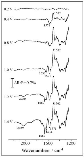 A Nicolet 5700 spectrometer (Thermo Electron Scientific Instruments, Madison, WI, USA) equipped with an N2-cooled mercury cadmium telluride detector was employed for the in situ FTIR experiments. The working Pt disc electrode was mirror-polished with alumina powder, and the spectroelectrochemical cell used a prismatic CaF2 window beveled at 60° in order to increase the beam intensity reaching the infrared (IR) detector. All of the spectra were collected at the same 8 cm−1 resolution using deuterated water (99.9% D) as the solvent. The processed spectra have been presented in the standard mode ΔR/R.