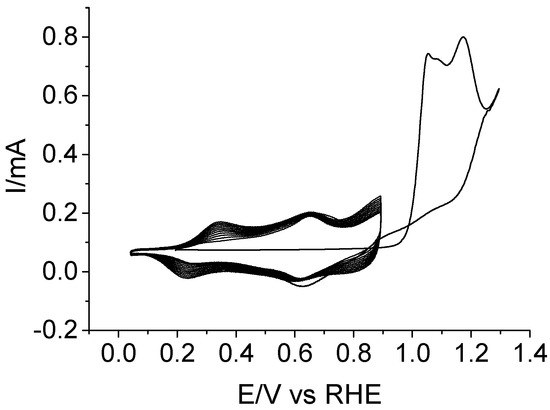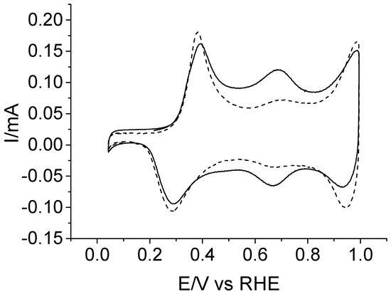 Cyclic voltammetry (CV) curves recorded for a polycrystalline platinum electrode immersed in 1 M of HClO4 + 10 mM piperazine solution are illustrated in Figure 1. The electrode was immersed at a controlled potential of 0.1 V, and the response was firstly examined in the 0.05–0.5 V potential range (Figure 1a). Two oxidation peaks were observed at 0.18 and 0.30 V during the forward scan up to 0.5 V. Both features are related with the electrochemistry of partially blocked adsorption sites at the platinum surface in perchloric medium [18], which reveals that piperazine strongly adsorbs on this electrode. In a new experiment, the clean electrode was immersed at 0.1 V, and the potential was scanned up to 1.4 V to examine the anodic behavior of piperazine. The onset of oxidation occurs at about 0.5 V, but the electrochemical process appears more clear at potentials higher than, roughly, 1.0 V in the form of a broad current, with no well-defined peaks. The voltammetric profile recorded during the reverse scan does not reach the characteristic shape of a Pt electrode (Figure 1b, dashed line). This result indicates that some adsorbed species coming from piperazine oxidation still remain on the electrode surface and block part of Pt adsorption sites. However, as expected, no electropolymerization of piperazine is observed after continuous potential cycling, with the voltammetric profile being almost equivalent to that shown in the solid line of Figure 1b.