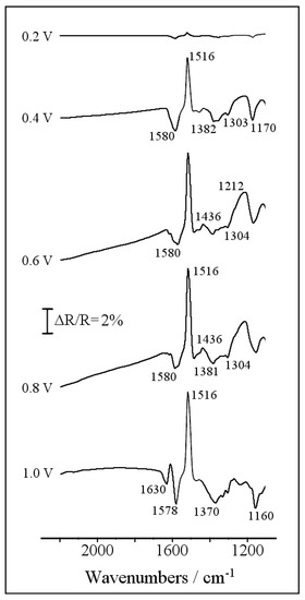 In order to monitor the redox behavior of the copolymer and analyze the chemical nature of the species involved in the redox transitions (particularly the existence of a keto-hydroxypiperazine transformation), in situ FTIR spectroscopy experiments were performed for the copolymer. The Pt-modified electrode was transferred to the IR spectroelectrochemical cell, which contained a perchloric acid solution that was free of monomers and prepared with D2O to facilitate assignments in the 1500–1700 cm−1 spectral range. After some potential cycles within the stability window of the copolymer, the Pt surface was pressed against the prismatic CaF2 window, and a reference spectrum was collected at 0.1 V. Finally, the potential was stepped to higher values to collect sample spectra, and the results are displayed in Figure 5. Three main positive bands at 1516, 1436, and 1212 cm−1, and three clear negative bands at 1630, 1580, and 1170 cm−1 can be observed together with several features in the 1300–1400 cm−1 region. Some of the referred absorptions can be unambiguously assigned to the presence of a polyaniline skeleton. Particularly, the complete disappearance of the leucoemeraldine state at 0.6 V is evidenced by the vanishing of the aromatic C-C stretching mode at 1516 cm−1 and of the C-N-C stretching at 1212 cm−1 [27,28]. The formation of oxidized emeraldine (0.6 V) and pernigraniline (1.0 V) structures is also supported by the development of quinoid C=C stretching vibrations at 1580 cm−1 [28,29], by the -CH in-plane bending at oxidized aniline rings at 1170 cm−1, and, finally, by the generation of several intermediate-order C-N vibrations in the 1300–1400 cm−1 frequency window [29,30]. On the other hand, the successful incorporation of piperazine structures to the polyaniline chain is evidenced by two representative bands, which cannot be observed for a pristine polyaniline. These absorptions correspond to the activation of the CH2 bending upon oxidation (positive-going feature at 1435 cm−1 [31]), and to the carbonyl C=O stretching at 1630 cm−1. This latter band supports the voltammetric result in Figure 3, and confirms that a significant fraction of piperazine rings are present in the form of electroactive ketopiperazines (C=O ⇌ C-OH). The absence of additional vibrations at around 1660 and 2030 cm−1 shows that neither amide structures nor isocyanates are formed and, consequently, that piperazine was not overoxidized during the electropolymerization process under the experimental conditions employed. FTIR assignments are collected in the Supplementary Material (Table S1).