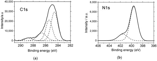 Additionally, the electrodeposited copolymer was examined by ex situ XPS in order to analyze its surface composition, and also to give support to the chemical structures suggested by in situ FTIR spectroscopy. A film grown after 10 voltammetric cycles as in Figure 3 was rinsed with ultrapure water, dried under nitrogen, stored in a dry place for 24 h, and then analyzed by XPS. Figure 6 shows the photoelectronic spectra of C 1s and N 1s core levels. The C 1s signal can be fitted with four peaks at 284.5, 285.4, 286.6, and 288.7 eV. Both the high energy level and the weak intensity of the latter contribution are compatible with the presence of a small amount of carbonyl carbon, which was probably associated to the ketopiperazine centers. On the other hand, there are two major signals that were undoubtedly associated to aromatic carbon, and hence to aniline rings. This is the main peak at 284.6 eV, which was attributed to plain aromatic carbon, and the signal at 285.4 eV, which was due to aromatic carbon bonded to neutral nitrogen. On the other hand, binding energies at around 286.6 eV are characteristic of carbon bonded to positive nitrogen [32], and consequently, this peak is compatible with the presence of piperazine rings within the polymer backbone. The best fit for the N 1s spectrum shows only two contributions at 399.6 and 401.6 eV, but unfortunately, it is not possible to distinguish signals coming from the piperazine and aniline environments. The peak at 399.6 eV is clearly attributed to neutral nitrogen, but it could be associated to any of the amine, imine or even amide groups, as these species do not show significantly different chemical shifts. In the same way, the higher binding energy signal at 401.6 eV is compatible with the presence of piperazine within the material. That peak is assigned to positively charged nitrogen atoms resulting from the protonation of imine centers (located exclusively at aniline rings) and secondary amine positions (at both piperazine and aniline rings) [32].