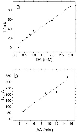 Platinum electrodes coated with copolymer films have been employed to determine dopamine (DA) and ascorbic acid (AA) in synthetic samples. The sensitivity of the measurement and the catalytic performance of the copolymer have been evaluated in acidic medium. First, DA samples were prepared within a concentration range from 0.2 to 3.0 mM. Then, the oxidation current of this analyte was recorded for the Pt electrode covered with the copolymer at a potential of 0.85 V, which corresponds to the first anodic peak of the DA→DQ reaction (see Figure S1 in Supplementary Materials for a CV curve). This anodic peak potential is nearly the same as that reported in the literature for bare Pt electrodes in acidic medium [35,36]. Figure 8a shows how the oxidation current of dopamine increases almost linearly at increasing analyte concentrations. From that plot, it can be derived that the copolymer demonstrates quite a sensitive response, in the order of 29 μA mM−1, within the range of concentrations studied. A similar electrocatalytic effect can be observed in Figure 8b for AA electrooxidation. For such a reaction, cyclic voltammograms recorded with a Pt electrode covered with the copolymer material (see Figure S2 in Supplementary Materials for a CV curve) shows the anodic peak centered at 0.89 V, which is a value slightly below that usually obtained for bare Pt surfaces under similar experimental conditions [37,38]. Also in this case, the determination of AA on the copolymer substrate shows linearly increasing faradaic responses with a sensitivity of about 22 μA mM−1.