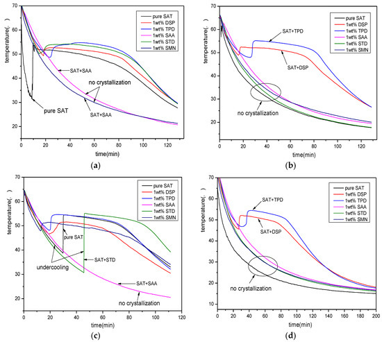 From Figure 2, it can be seen that the pure SAT sample appears undercooling during the first discharging process. The temperature of the SAT sample begins to decrease after reaching 32 °C and the degree of undercooling reaches 23 K. During the subsequent three discharging process, the pure SAT sample is always liquid and there is no phase change crystallization. The five samples with nucleating agents appear with different phase change crystallization effects during four discharging processes. Among them, samples with SAA do not undergo phase change crystallization during the four discharging process. It shows that SAA has no nucleating effect on SAT and it is not suitable to be sued as a nucleating agent for SAT. The SAT sample with STD and SMN appears in different degrees of undercooling during the first and third discharging process. There is no phase change crystallization during the second and fourth discharging process. This shows that STD and SMN have a certain nucleation effect on SAT, but the nucleation is very unstable, so they are not suitable as a good nucleating agent for SAT. However, the SAT samples with DSP and TPD have stable crystallization during the four discharging process, and demonstrate good phase-change constant-temperature platform. Therefore, they can be used as an alternative nucleating agent for SAT.