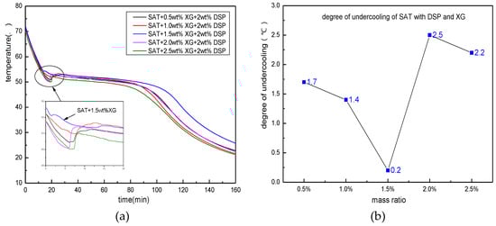 Figure 7 shows the heating/cooling curve of five parts of SAT samples which contain 2 wt % of the nucleating agent and 0.5, 1, 1.5, 2, 2.5 wt % of thickeners. It can be seen from the cooling process of the sample in the figure that the degree of undercooling of the sample shows a downward tendency when the amount of XG is increased from 0.5 to 1.5 wt %. When the content of XG is 1.5 wt %, the degree of undercooling decreases to 0.2 K. However, when the amount of XG increases from 1.5 to 2.5 wt %, the degree of undercooling of the sample increases to 2 K or above. When the amount of addition is 2 wt %, the degree of undercooling is 2.5 K, which is greater than the degree of undercooling without the addition of XG. It can be seen that a certain proportion of thickeners can help the nucleating agent to hinder the SAT’s undercooling. The combined effects of the two can minimize the degree of undercooling. However, the amount of thickener should not be too large. The reason for this phenomenon can be explained by the mechanism of the thickener as below. The thickener has a strong water absorption effect. After it is mixed with the SAT, it will absorb part of the crystal water of the SAT, making itself very viscous. After the XG absorbs water, the mucus will cover the nucleus of the SAT, inhibiting its crystallization and growth, and cause the SAT’s degree of undercooling to increase. In addition, if the amount of thickener is too large, it will affect the heat storage density and heat transfer of the SAT. Therefore, the addition amount of the thickener should not be too large, and should be controlled at approximately 1 to 1.5 wt %.