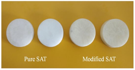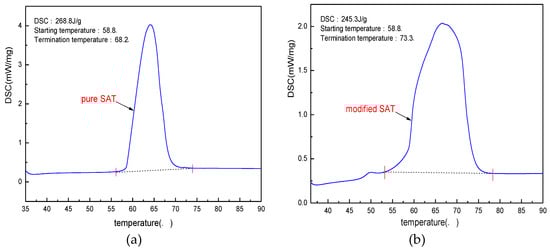 According to the experimental results from Section 3.1 to Section 3.3, the optimal ratio of the modified SAT is determined as 96.5 wt % of SAT, 2 wt % of DSP and 1.5 wt % of XG. The modified SAT sample is prepared according to the ratio. The phase transition characteristics of the pure SAT and the modified SAT are analyzed by a differential scanning calorimetry instrument. The results of the test are shown in Figure 8.