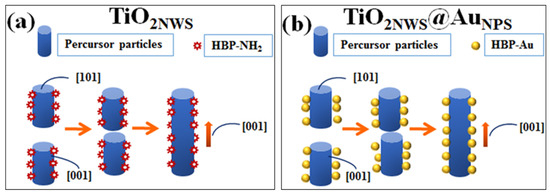 The formation mechanism of the nanowires can be explained by Figure 3a. Some studies reported that the surface density of six-fold-coordinated Ti-atoms with hydroxyls on (001) surface structure was much higher than the (101) surface [30,31]. The number of hydroxyl groups was estimated to 7.0 nm−2 for (001) surface and 5.1 nm−2 for (101) surface [32]. The (001) plane adsorbed much more HBP-NH2 than the (101) plane for hydrogen bonds formed by hydroxyl and amino groups. This also hindered the contact between (001) planes. As shown in the schematic model, oriented attachment on the (101) plane could occur, attributed to high concentrations of HBP- NH2 which would restrict the growth of cross-sections.
