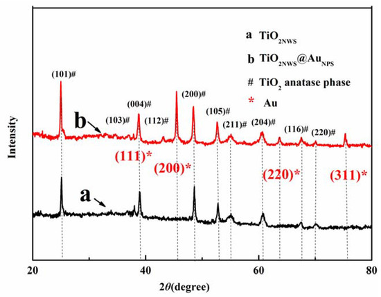 Figure 4 depicts the XRD patterns of pure TiO2NWS and TiO2NWS@AuNPS nanocomposite prepared by one step in situ hydrothermal method. The XRD pattern contained line (a) corresponding to pure TiO2NW and line (b) of TiO2NWS@AuNPS. Both samples showed 6 distinct peaks, indexed as (101), (004), (200), (105), (211) and (204) lattice planes (black hash symbol). By consulting the standard color card (JCPDSPDF#: 021-1272), no rutile or irrelevant diffraction peaks were observed [33,34]. The crystal shapes of the diffraction peaks looked clear and sharp, indicating well-formed crystals of the material in anatase. In addition, the (111), (200), (220) and (311) lattice planes (red five-point star) belonged to Au, which were uniformly distributed on TiO2NWS surface. This suggested the successful formation of gold particles in the composites, which were dispersed on TiO2NWS surface [35]. No other lattice planes were found in (103), (004) and (112), which may be due to the proximity to strong lattices of Au (111) that overlapped each other. The (200) crystal surface of Au was brought into the Scherrer Formula: (), and the calculated mean diameter of AuNP was estimated to 7 nm. The diameter agreed with TEM results.
