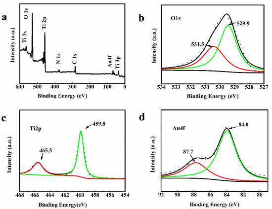 To further explain the differences in reactivities between both Au-loaded and pure TiO2NWS, XPS analyses were conducted to investigate the surface oxidation states of Ti 2p, Au 4f, and O 1s core levels. The XPS results are summarized in Figure 6a and the original spectra are provided in Figure 6b–d. The XPS profiles of TiO2NWS@AuNPS showed binding energy peaks of C, Ti, O, N, and Au (Figure 6a). The presence of Au peak indicated the successful immobilization of AuNPS on TiO2NWS. The C 1s and N 1s were attributed to the incomplete removal HBP-NH2. The high–resolution Ti 2p XPS spectrum in Figure 6c showed two binding energy (BE) peaks at 465.5 eV and 459.8 eV, corresponding to Ti 2p1/2 and Ti 2p3/2 spin-orbit in TiO2NWS, respectively. After Au doping, the Ti position shifted to high energy of about 1.2 eV, resulting from electron in titanium dioxide oxygen void transferred to the gold particles [36]. Furthermore, the distance between the two peaks was nearly 5.7 eV, indicating that titanium existed in the crystal lattice as Ti4+ [37,38,39]. The O 1s XPS spectrum showed TiO2NWS@AuNPS a lower binding energy of 529.78 eV (Figure 6b), characteristic of Ti-O bond. Also, a higher binding energy of 531.25 eV characteristic of O–H bonds appeared [40,41,42]. Figure 6d showed the high electron spectrum of Au 4f region. The two BE peaks at 84.0 eV and 87.7 eV corresponded to Au 4f7/2 and Au 4f5/2 spin-orbit energies [43]. The distance between the two peaks was 3.7 eV, meaning that the samples contained one state of Au, namely Au0. In addition, all HAuCl4 was reduced [44]. The pattern showed clear peaks at positions and locations of binding energies matching reported values.