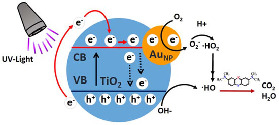 Based on the above findings and associated discussions presented previously, a schematic depiction of possible reaction mechanisms of the catalytic process was presented in Figure 8 (with dark pre-treatment). Under UV light, electrons in the valence band (VB) of TiO2 moved to the conduction band (CB), leaving holes at the valence band (VB). These electrons then reduced O2 in TiO2 to O2− anion radicals, with hole oxidation OH to ·HO free radical. Next, they moved to CB of TiO2 to be further trapped by neighboring AuNPS. Afterward, the electrons reduced O2 present on AuNPS to O2−. These radicals could receive more electrons to become ·HO. Meanwhile, holes in VB oxidized water present on TiO2 to induce ·HO free radicals. Next, ·HO would oxidize MB to form degradation products. Consequently, the synergic effect of oxidation states of gold, including two BE peaks at 87.7 and 84.0 eV (Figure 7d), significantly enhanced the photocatalytic performance of TiO2NWS@AuNPS. Moreover, FTIR results showed the formation of more OH species following Au loading. This was believed to occur during the leading step to increase ·HO free radicals on the TiO2 surface. On the other hand, the crystal structures of Au nanoparticles and TiO2NWS were different, and hence defects and crystal barriers were inevitable at the interfaces of TiO2NWS and Au nanoparticles. Therefore, tremendous defects and barriers existed in AuNP. The presence of few interfaces of Au particles could significantly reduce recombination of electrons and holes [48]. Conversely, pure TiO2NWS did not provide distinct transfer paths for electrons, causing easy recombination of electrons and holes. Furthermore, the electrons in the CB can transfer from TiO2NWS to AuNPS, resulting from a Schottky barrier being formed at the metal-semiconductor interface [49]. It may be lead to the photo-induced electrons being trapped by AuNPS under UV irradiation, and electrons could reduce O2 in TiO2 to O2− anion radicals. Therefore, low recombination of photogenerated carriers and high photocatalytic activity made TiO2NWS@AuNPS provide valuable scaffold for many potential applications, such as photo electrocatalysts, solar cells, hydrogen generation by water splitting, and sensors.