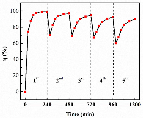 Reusability is an essential parameter for potential practical application and further analysis of the mechanism of the catalysis between the catalyst and pollutant. The reusability of TiO2NWS@AuNPS (5 at% Au) was investigated by operating the catalyzation process for five consecutive cycles and the degradation amount at each cycle was detected. As displayed in Figure 9, the degradation efficiency for the MB was still above 90% of their initial amounts in the 5th regeneration cycle. Thus, the TiO2NWS@AuNP catalyst can be recycled almost without obvious loss in the catalytic performance, demonstrating a benign renewable catalyst.