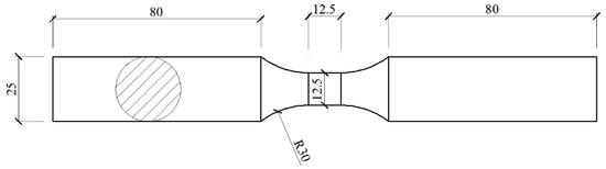 Zhou et al. [20] suggested that the feasibility of small-gauge-length specimen can be verified by comparing the tensile test results of conventional-gauge-length specimens with those of small-gauge-length specimens. The tensile specimen was designed according to national design standard GB/T 228.1-2010 [23], as shown in Figure 3, in which the gauge length was 70 mm and gauge diameter was 12.5 mm.
