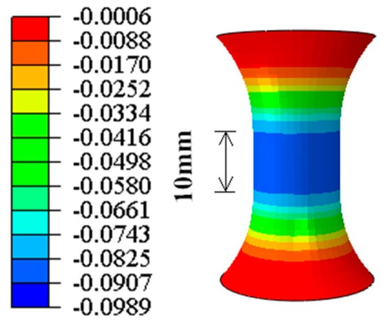 The stress state of the small-gauge-length specimen may be in a triaxial stress state under high strain when the grip section and the fillet are larger than the gauge length. The strain distribution is nonuniform in the triaxial stress state, and the nonuniform strain distribution cannot satisfy the requirement of the extensometer. In this study, the finite element analysis software ABAQUS was used to analyze the strain distribution within the gauge length section of the specimen under compression. The finite element analysis uses a solid element. The constitutive model was the kinematic-hardening model and the specified value was selected for the material parameter from the standard CECS 410: 2015 [22]. The simulation results in Figure 2 show that when a −10% compressive strain was imposed on the small-gauge-length specimen, the strain was evenly distributed along the gauge length section, and the influence of the grip section and the fillet could be ignored. The strain distribution therefore satisfied the requirements of the extensometer.