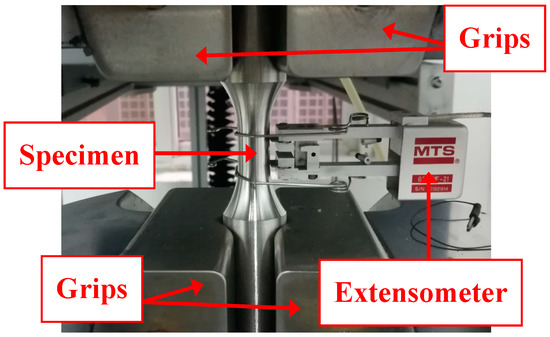 The stainless steel plates were cut in the rolled direction. The test specimens were manufactured from stainless steel plates into round test coupons. The reduced section and round transition zone were machined using the numerically controlled equipment. The surfaces of the specimens were carefully polished using different grit sandpapers to eliminate surface defects. The test was performed on an MTS Landmark 370 hydraulic servo material testing machine with a maximum loading force of 500 kN. Computer-controlled loading procedures were used during the test. The test procedure complied with GB/T 7314-2005 [17]. During the test, the strains of the conventional-gauge-length specimens and small-gauge-length specimens were determined by an extensometer with a gauge length of 50 mm (strain measurement range −10% to +50%) and a gauge length of 10 mm (strain measurement range −10% to +20%), respectively. The extensometer models used were MTS 634.25F-24 and MTS 634.31F-21. The arrangement of the measuring device is shown in Figure 4. The force was measured by a force sensor of the testing machine and all data were recorded by a computer. When the stress was less than the nominal yield strength, the loading rate was 0.1 mm/min. When the stress was greater than the nominal yield strength, the loading rate was 0.5 mm/min. The recording frequency of the extensometer was 10 Hz.