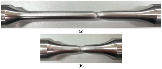 Figure 5 shows photographs of the two specimens after fracture. The necking of the specimens is obvious before fracture. It shows that the two specimens had a large plastic deformation before fracture, which represents the true performance of the stainless steel. Figure 6 shows the true stress-true strain curves of the conventional-gauge-length specimen and the small-gauge-length specimen obtained from the tensile test. The 10% strain was consistent for both samples and the test curve of the small-gauge-length specimen was slightly higher than the conventional-gauge-length specimen’s test curve. This shows that the small-gauge-length specimen was uniformly deformed within the 10% strain of the gauge length section. Table 3 shows the nominal yield strength, tensile strength, and elongation after fracture of the two specimens. The measured strength values of the two test pieces were almost the same and the elongation after breaking was different. The elongation after fracture was inversely proportional to the length of the gauge length section; thus, the elongation after fracture of the small-gauge-length specimen was greater than that of the conventional-gauge-length specimen [25].