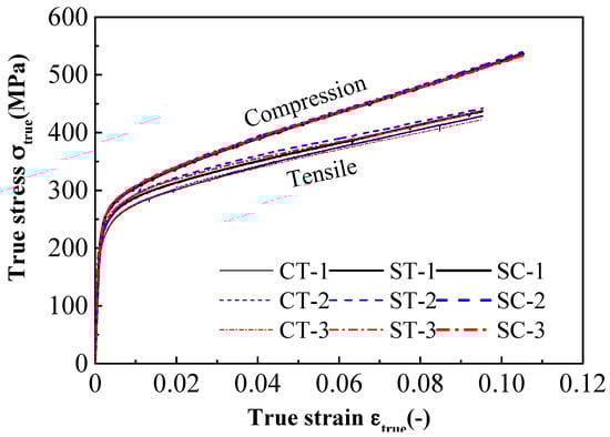 The mechanical properties of compressive specimens are shown in Table 3. The tensile and compressive deformation modulus values (including initial modulus and secant modulus) were the same, as shown in Table 3. The true stress-true strain curves obtained by the compressive tests up to 10% strain are shown in Figure 6. There were significant differences in the strength values, as observed from the compression and tension test results. The proof stress values of the small-gauge-length specimens at 1% strain were 292 MPa and 316 MPa (i.e., difference of 8%) and at 10% strain, the values were 407 MPa and 601 MPa (difference of 48%) under tensile and compressive loading, respectively. The material anisotropy was found to be more remarkable at a higher level of imposed strain. This characteristic can be attributed to the strain-induced transformation phenomenon of austenite to martensite in stainless steel [8]. Since the formation of martensite is suppressed under tensile loading but is promoted under compressive loading [27,28], the proportion of martensite increases at high compressive strains, which enhances the strain hardenability of the austenitic stainless steel and postpones the onset of necking [8]. Therefore, the higher proportion of martensite caused by the high compressive loading is the main reason for the material anisotropy of stainless steel. In our study, when the true strain was 1%, the true stress-true strain curve of the tensile test and compression test of the small-gauge-length specimen began to separate, and with the increase in true strain, the difference in true stress between the two increased. When the true strain reached 10%, the true stress difference between the two exceeded 80 MPa (Figure 6). The comparison of the strength values measured in the compression test and tensile test of the small-gauge-length specimens, shown in Table 3, reveals that the nominal yield strength measured by the compression test of the small-gauge-length specimens was higher than the nominal yield strength measured by the tensile test of the conventional-gauge-length specimens. The elongation after fracture measured by the tensile test of the small-gauge-length specimens was much greater than that of the conventional-gauge-length specimens, and the difference in elongation after fracture between the conventional-gauge-length specimens and small-gauge-length specimens was due to the large difference in the ratio of the contraction segment to the standardization segment of the two specimens. The difference between the tensile and compressive stress-strain curves increased with increase of the strain. This is related to the different strain-hardening behavior being attributed to different microstructure evolution under the tensile and compressive loading.