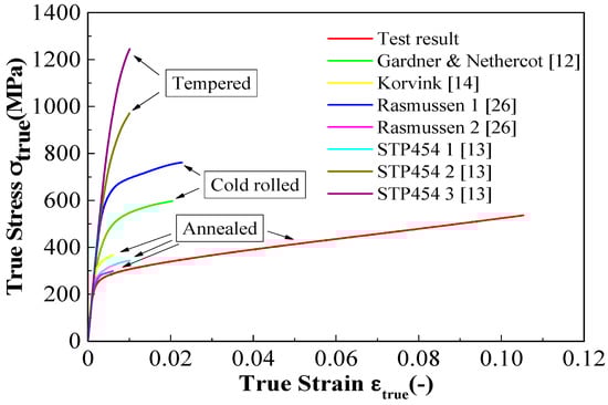 The strain-hardening behavior of the austenitic stainless steel in compression tests is affected by the manufacturing process. Considering the manufacturing process of the austenitic stainless steel, the published experimental results can be classified into three grades: annealed condition, tempered condition, and cold-formed condition. The material anisotropy is higher in the tempered condition and cold-formed condition [1,13]. We compared the mean stress-strain curve of the compressive test results with the published experimental results for the different manufacturing processes (Figure 8). The austenitic stainless steel adopted in this study was manufactured under the hot-rolled annealed condition. The results obtained under tempered and cold-formed conditions [12,14,26] are above the compressive stress-strain curve obtained in this study (Figure 8). In Figure 8, the compressive stress-strain curve is in agreement with the stress-strain curve under the annealed condition reported by Johnson and Kelsen [13] and Rasmussen et al. [26]. The test results represent the compressive behavior of austenitic stainless steel under the annealed condition.