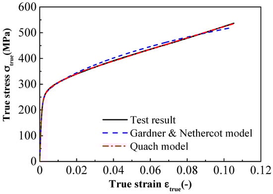 In the field of civil engineering, there are two constitutive models that describe the compressive properties of stainless steel: (1) Gardner and Nethercot revised model based on the Ramberg–Osgood model [12] and (2) Quach et al.’s three-stage model [11]. The modified model of Gardner and Nethercot is a combination of two Ramberg–Osgood models and is in good agreement with the stress-strain curve of stainless steel: