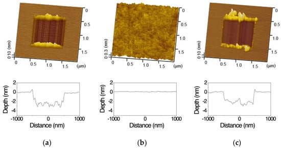 In order to locate the wear scars on silicon surface in different humid conditions, a series of scratch marks were prepared before the wear tests. Meanwhile, a repeated wear test of silicon at 60% RH was performed to seek out the wear reason of silicon at 90% RH. The topography and depth of wear scars formed on the silicon surface are shown in Figure 2. The wear of silicon was serious at 60% RH. Wear depth was around 3 nm and a lot of wear debris formed on the both ends of sliding direction, as shown in Figure 2a. However, the wear on the silicon sample surface was restrained and no noticeable wear scar formed when the value of RH increased from 60% to 90%, as shown in Figure 2b. It was also found that the roughness of the wear scar was close to that of the silicon sample surface.